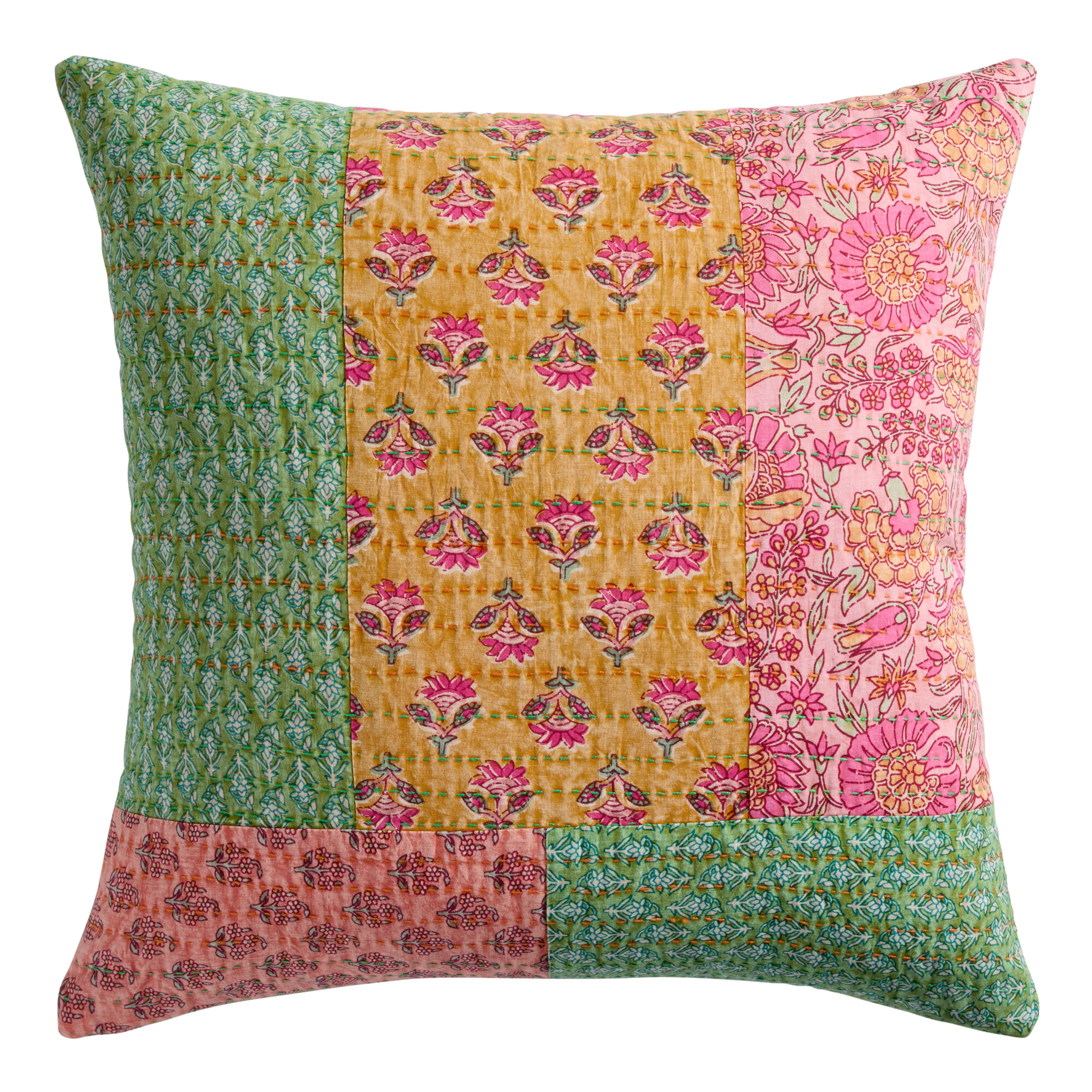 A patchwork pillow made from vintage saris using the traditional "Kantha" technique—designed to brighten your space and tell a story.