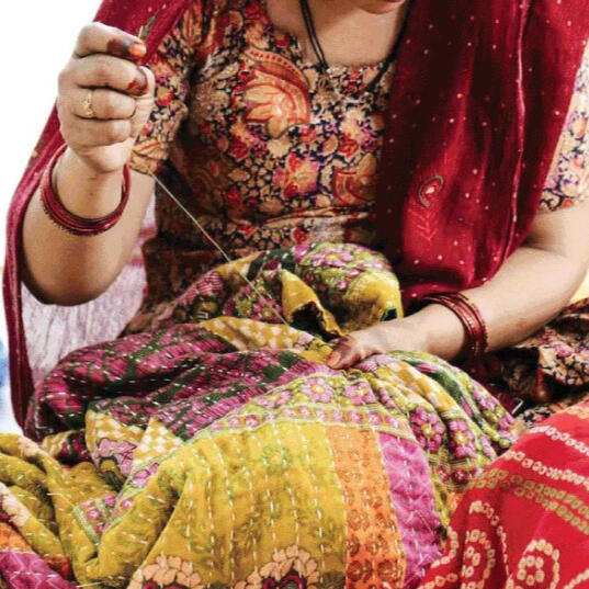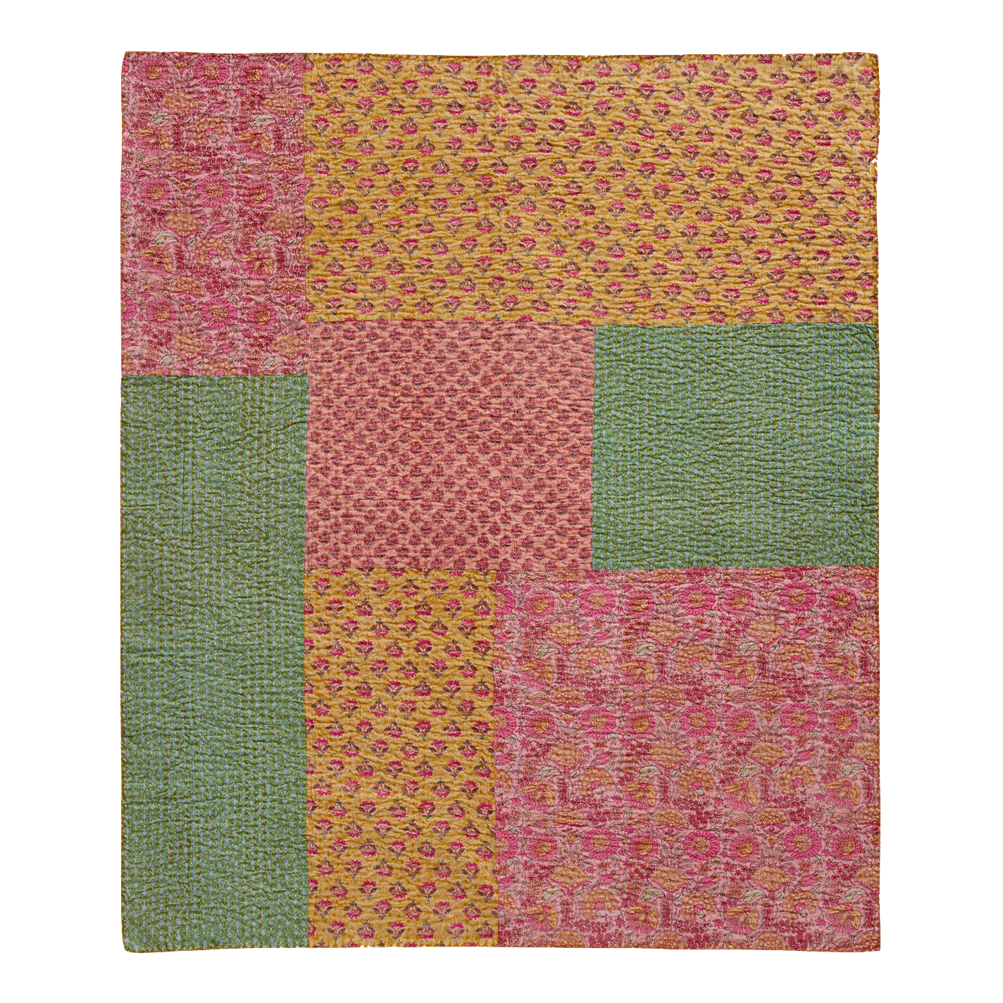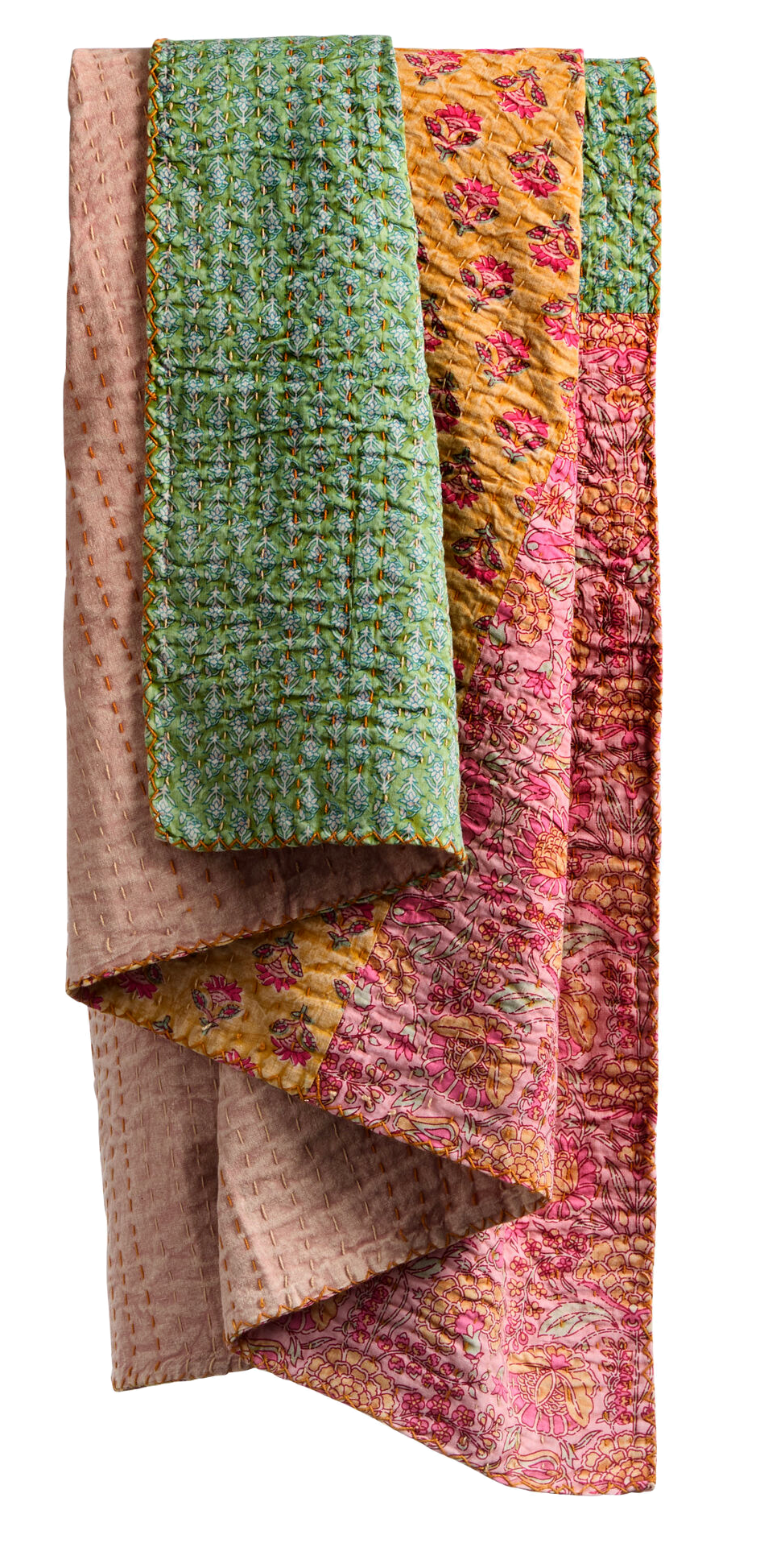 Handcrafted in Rajasthan, India, this throw is tradition, artistry, and reinvention stitched together. Each piece is made from reclaimed vintage cotton saris, carefully selected for their vibrant colors and patterns.Local artisans in small villages around Jaipur hand-layer these fabrics and stitch them together using a traditional embroidery technique called Kantha—thousands of tiny running stitches that create texture, strength, and soul.The result is a reversible quilted throw unlike any other: no two are alike. You might spot faint marks of its past life—a bit of fading, a contrasting patch, or thread variations. These are not flaws.This is slow craft. Made in small batches. And made to last.