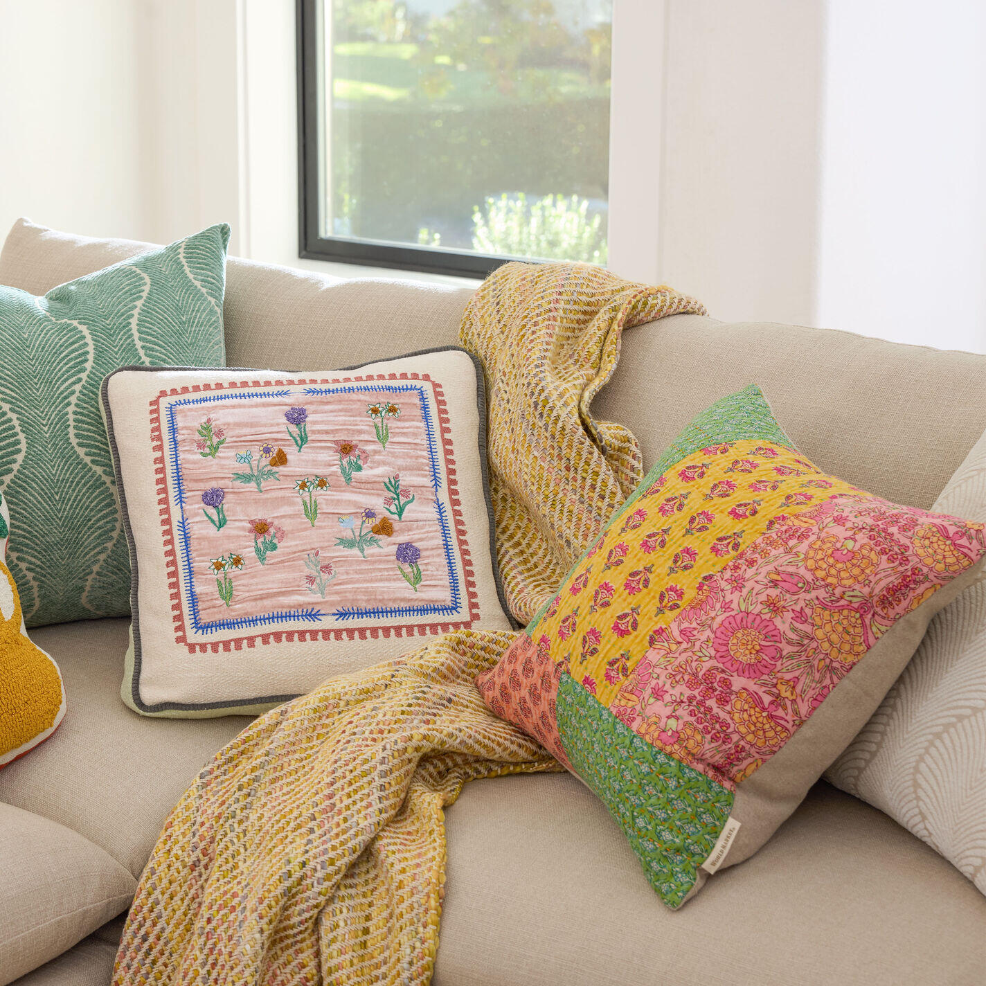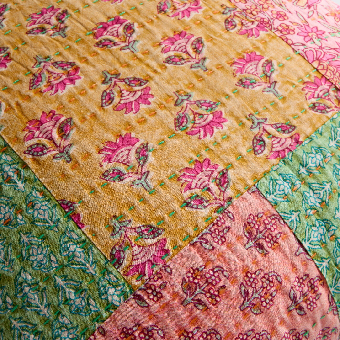 A patchwork pillow made from vintage saris using the traditional "Kantha" technique—designed to brighten your space and tell a story.