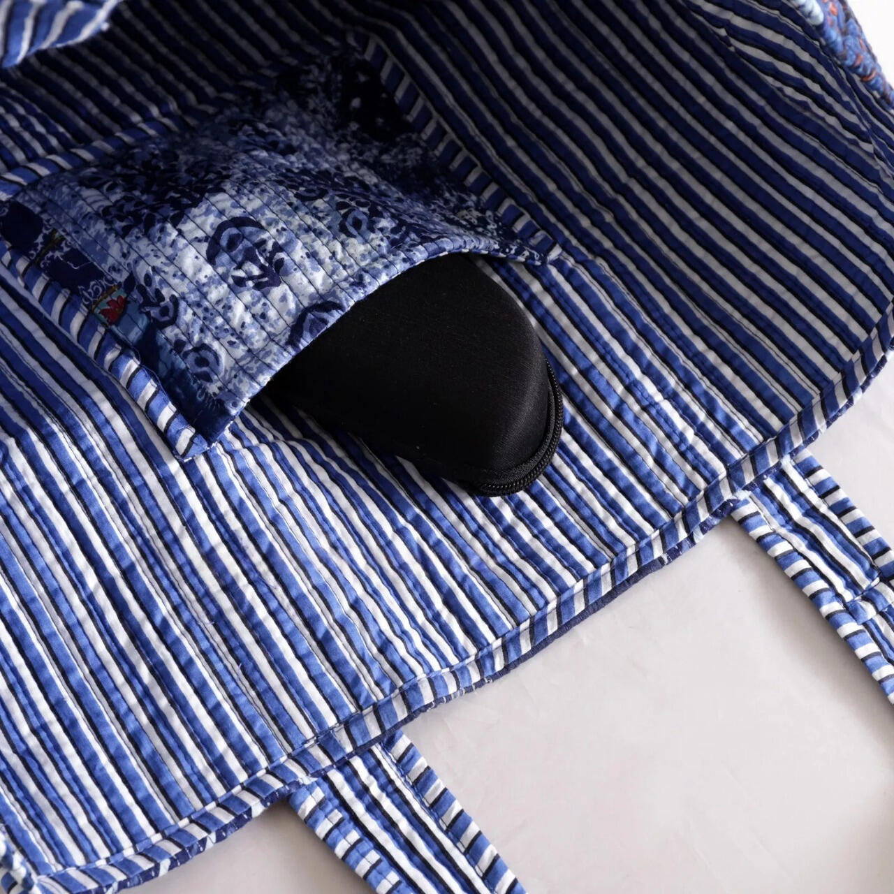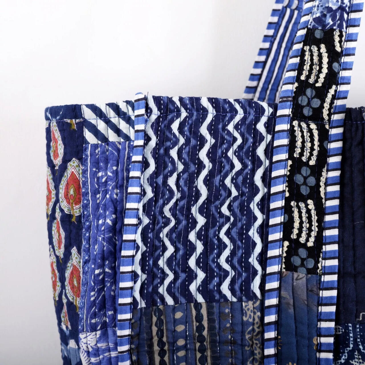 A bold, quilted tote, made from reclaimed cotton fabrics in rural northern India. Versatile and eye-catching, each one tells its own tale.